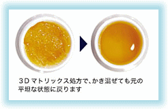 形状再現の3Dマトリックス構造を持つゲルです。かき混ぜてもすぐに元の平坦な状態に戻るゲルが、ぴんっとハリのある肌に導いてくれます。